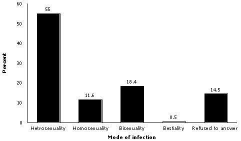 Sixty-seven men (14.5%) refused to reveal the source of infection. More than half of the men (55%) had acquired the infection through sex with women, 11.6% through sex with men, 18.4% through sex with men and/or women and only 2 men (0.5%) reported practicing bestiality (Fig-1). Among 78.1% of those, who contracted the infection heterosexually, the source of infection was a sex worker and women other than sex worker in 21.9% cases. No one mentioned that he got infection from his wife.