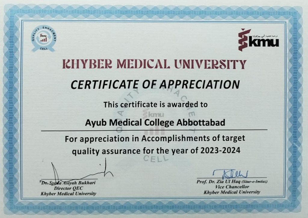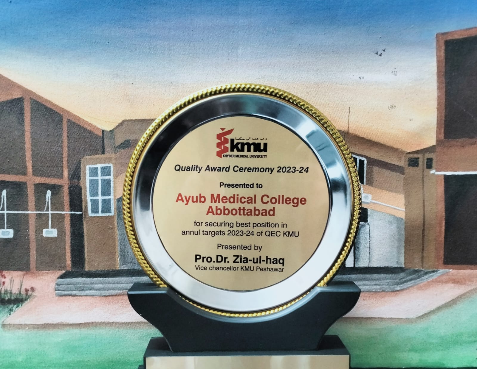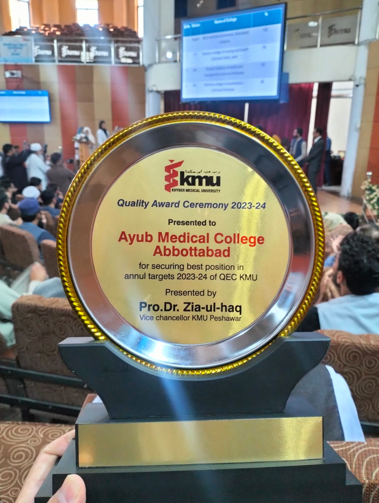 Ayub Medical College, Abbottabad, continues its legacy of excellence by securing the Best Position (highest category) in the Quality Awards Ceremony organized by the Quality Enhancement Cell (QEC), Khyber Medical University (KMU), for the year 2023-24. The college has consistently maintained this top-tier status since 2021.