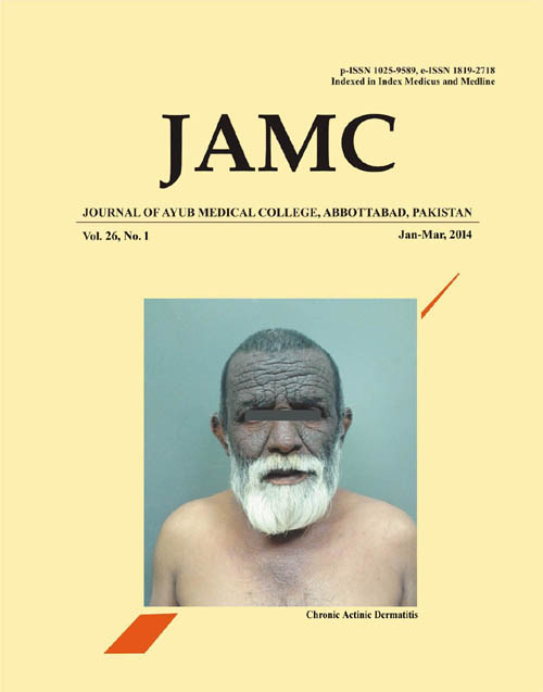Journal of Ayub Medical College, Abbottabad is an OPEN ACCESS JOURNAL which means that all content is FREELY available without charge to all users whether registered with the journal or not. The work published by J Ayub Med Coll Abbottabad is licensed and distributed under the creative commons License CC BY ND Attribution-NoDerivs. Material printed in this journal is OPEN to access, and are FREE for use in academic and research work with proper citation. J Ayub Med Coll Abbottabad accepts only original material for publication with the understanding that except for abstracts, no part of the data has been published or will be submitted for publication elsewhere before appearing in J Ayub Med Coll Abbottabad. The Editorial Board of J Ayub Med Coll Abbottabad makes every effort to ensure the accuracy and authenticity of material printed in J Ayub Med Coll Abbottabad. However, conclusions and statements expressed are views of the authors and do not reflect the opinion/policy of J Ayub Med Coll Abbottabad or the Editorial Board.