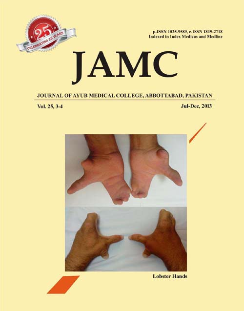 Journal of Ayub Medical College, Abbottabad is an OPEN ACCESS JOURNAL which means that all content is FREELY available without charge to all users whether registered with the journal or not. The work published by J Ayub Med Coll Abbottabad is licensed and distributed under the creative commons License CC BY ND Attribution-NoDerivs. Material printed in this journal is OPEN to access, and are FREE for use in academic and research work with proper citation. J Ayub Med Coll Abbottabad accepts only original material for publication with the understanding that except for abstracts, no part of the data has been published or will be submitted for publication elsewhere before appearing in J Ayub Med Coll Abbottabad. The Editorial Board of J Ayub Med Coll Abbottabad makes every effort to ensure the accuracy and authenticity of material printed in J Ayub Med Coll Abbottabad. However, conclusions and statements expressed are views of the authors and do not reflect the opinion/policy of J Ayub Med Coll Abbottabad or the Editorial Board.