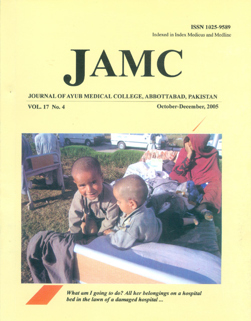 Journal of Ayub Medical College, Abbottabad is an OPEN ACCESS JOURNAL which means that all content is FREELY available without charge to all users whether registered with the journal or not. The work published by J Ayub Med Coll Abbottabad is licensed and distributed under the creative commons License CC BY ND Attribution-NoDerivs. Material printed in this journal is OPEN to access, and are FREE for use in academic and research work with proper citation. J Ayub Med Coll Abbottabad accepts only original material for publication with the understanding that except for abstracts, no part of the data has been published or will be submitted for publication elsewhere before appearing in J Ayub Med Coll Abbottabad. The Editorial Board of J Ayub Med Coll Abbottabad makes every effort to ensure the accuracy and authenticity of material printed in J Ayub Med Coll Abbottabad. However, conclusions and statements expressed are views of the authors and do not reflect the opinion/policy of J Ayub Med Coll Abbottabad or the Editorial Board.