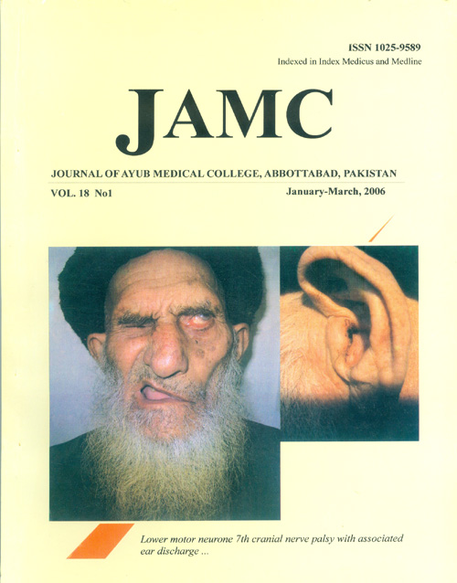 Journal of Ayub Medical College, Abbottabad is an OPEN ACCESS JOURNAL which means that all content is FREELY available without charge to all users whether registered with the journal or not. The work published by J Ayub Med Coll Abbottabad is licensed and distributed under the creative commons License CC BY ND Attribution-NoDerivs. Material printed in this journal is OPEN to access, and are FREE for use in academic and research work with proper citation. J Ayub Med Coll Abbottabad accepts only original material for publication with the understanding that except for abstracts, no part of the data has been published or will be submitted for publication elsewhere before appearing in J Ayub Med Coll Abbottabad. The Editorial Board of J Ayub Med Coll Abbottabad makes every effort to ensure the accuracy and authenticity of material printed in J Ayub Med Coll Abbottabad. However, conclusions and statements expressed are views of the authors and do not reflect the opinion/policy of J Ayub Med Coll Abbottabad or the Editorial Board.