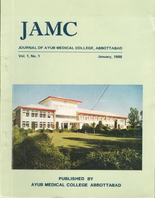 Journal of Ayub Medical College, Abbottabad is an OPEN ACCESS JOURNAL which means that all content is FREELY available without charge to all users whether registered with the journal or not. The work published by J Ayub Med Coll Abbottabad is licensed and distributed under the creative commons License CC BY ND Attribution-NoDerivs. Material printed in this journal is OPEN to access, and are FREE for use in academic and research work with proper citation. J Ayub Med Coll Abbottabad accepts only original material for publication with the understanding that except for abstracts, no part of the data has been published or will be submitted for publication elsewhere before appearing in J Ayub Med Coll Abbottabad. The Editorial Board of J Ayub Med Coll Abbottabad makes every effort to ensure the accuracy and authenticity of material printed in J Ayub Med Coll Abbottabad. However, conclusions and statements expressed are views of the authors and do not reflect the opinion/policy of J Ayub Med Coll Abbottabad or the Editorial Board.