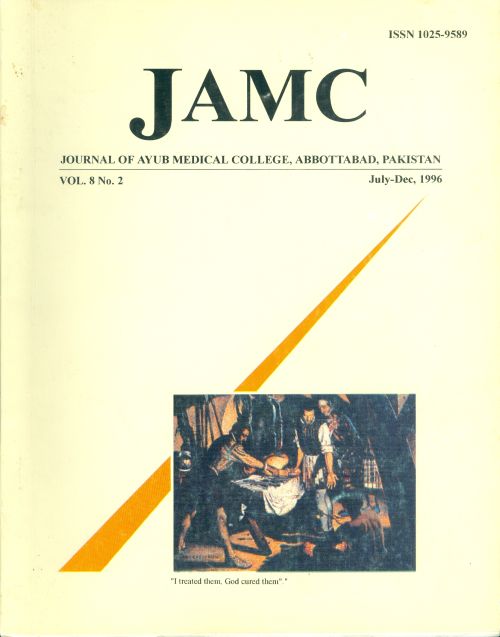 Journal of Ayub Medical College, Abbottabad is an OPEN ACCESS JOURNAL which means that all content is FREELY available without charge to all users whether registered with the journal or not. The work published by J Ayub Med Coll Abbottabad is licensed and distributed under the creative commons License CC BY ND Attribution-NoDerivs. Material printed in this journal is OPEN to access, and are FREE for use in academic and research work with proper citation. J Ayub Med Coll Abbottabad accepts only original material for publication with the understanding that except for abstracts, no part of the data has been published or will be submitted for publication elsewhere before appearing in J Ayub Med Coll Abbottabad. The Editorial Board of J Ayub Med Coll Abbottabad makes every effort to ensure the accuracy and authenticity of material printed in J Ayub Med Coll Abbottabad. However, conclusions and statements expressed are views of the authors and do not reflect the opinion/policy of J Ayub Med Coll Abbottabad or the Editorial Board.
