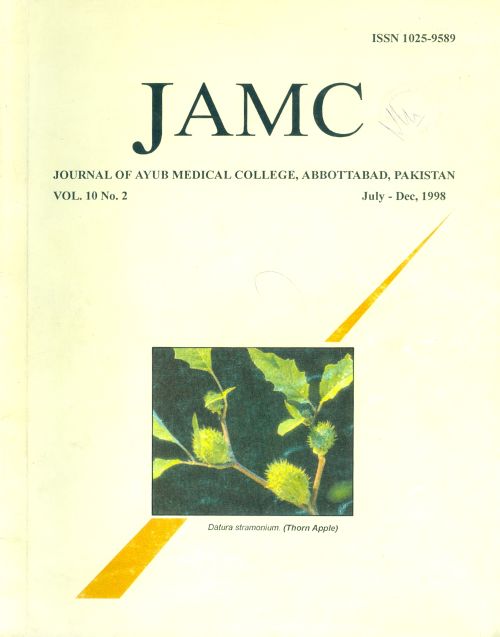 Journal of Ayub Medical College, Abbottabad is an OPEN ACCESS JOURNAL which means that all content is FREELY available without charge to all users whether registered with the journal or not. The work published by J Ayub Med Coll Abbottabad is licensed and distributed under the creative commons License CC BY ND Attribution-NoDerivs. Material printed in this journal is OPEN to access, and are FREE for use in academic and research work with proper citation. J Ayub Med Coll Abbottabad accepts only original material for publication with the understanding that except for abstracts, no part of the data has been published or will be submitted for publication elsewhere before appearing in J Ayub Med Coll Abbottabad. The Editorial Board of J Ayub Med Coll Abbottabad makes every effort to ensure the accuracy and authenticity of material printed in J Ayub Med Coll Abbottabad. However, conclusions and statements expressed are views of the authors and do not reflect the opinion/policy of J Ayub Med Coll Abbottabad or the Editorial Board.