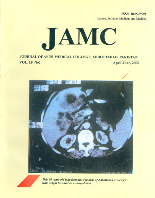Journal of Ayub Medical College, Abbottabad is an OPEN ACCESS JOURNAL which means that all content is FREELY available without charge to all users whether registered with the journal or not. The work published by J Ayub Med Coll Abbottabad is licensed and distributed under the creative commons License CC BY ND Attribution-NoDerivs. Material printed in this journal is OPEN to access, and are FREE for use in academic and research work with proper citation. J Ayub Med Coll Abbottabad accepts only original material for publication with the understanding that except for abstracts, no part of the data has been published or will be submitted for publication elsewhere before appearing in J Ayub Med Coll Abbottabad. The Editorial Board of J Ayub Med Coll Abbottabad makes every effort to ensure the accuracy and authenticity of material printed in J Ayub Med Coll Abbottabad. However, conclusions and statements expressed are views of the authors and do not reflect the opinion/policy of J Ayub Med Coll Abbottabad or the Editorial Board.