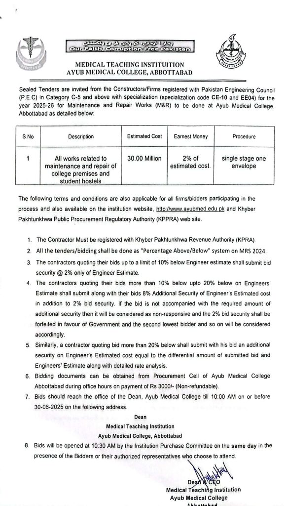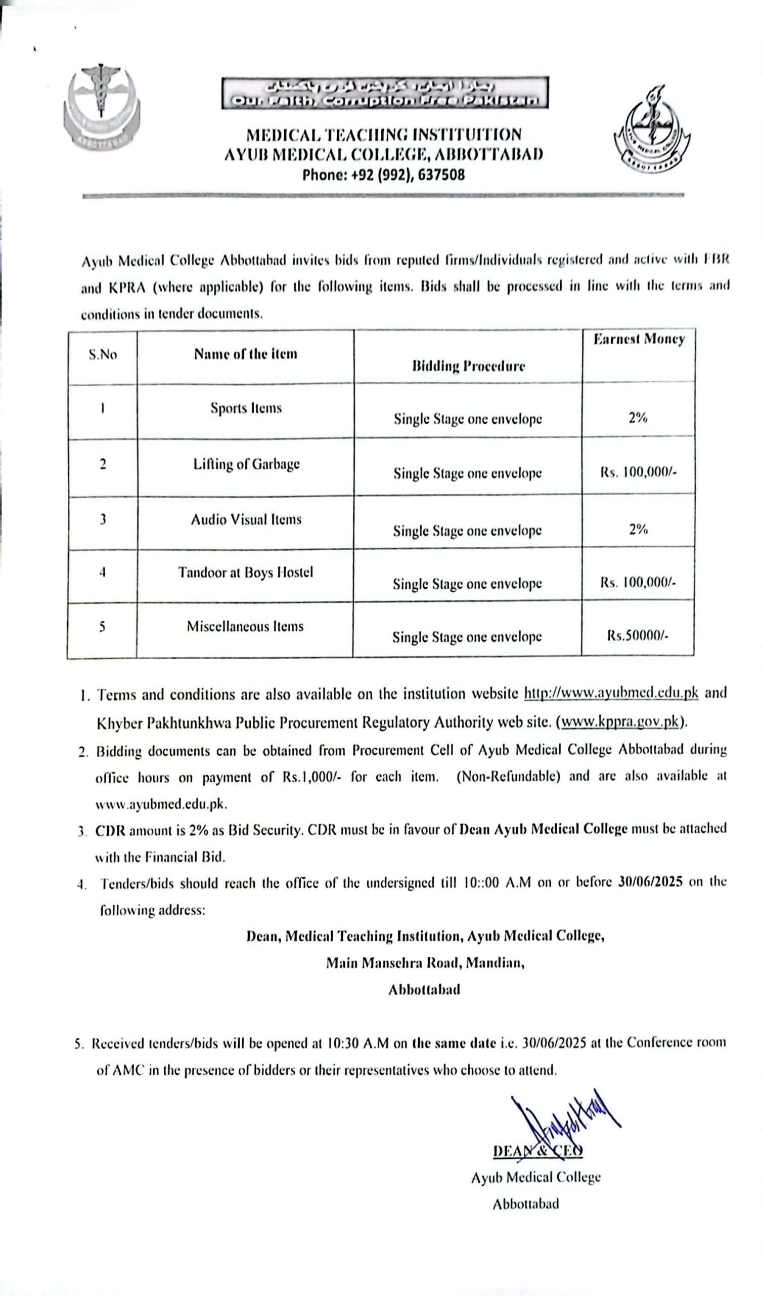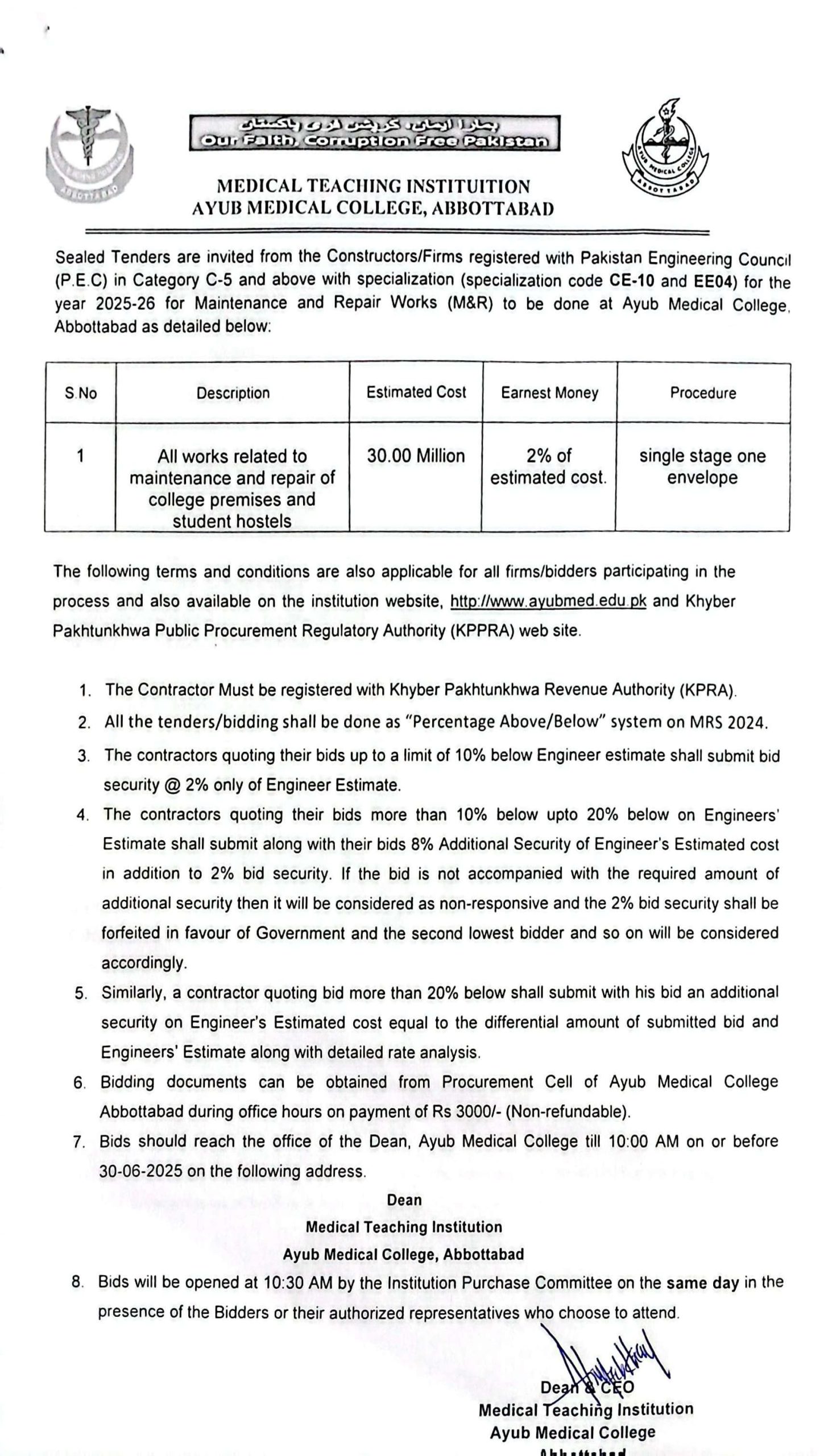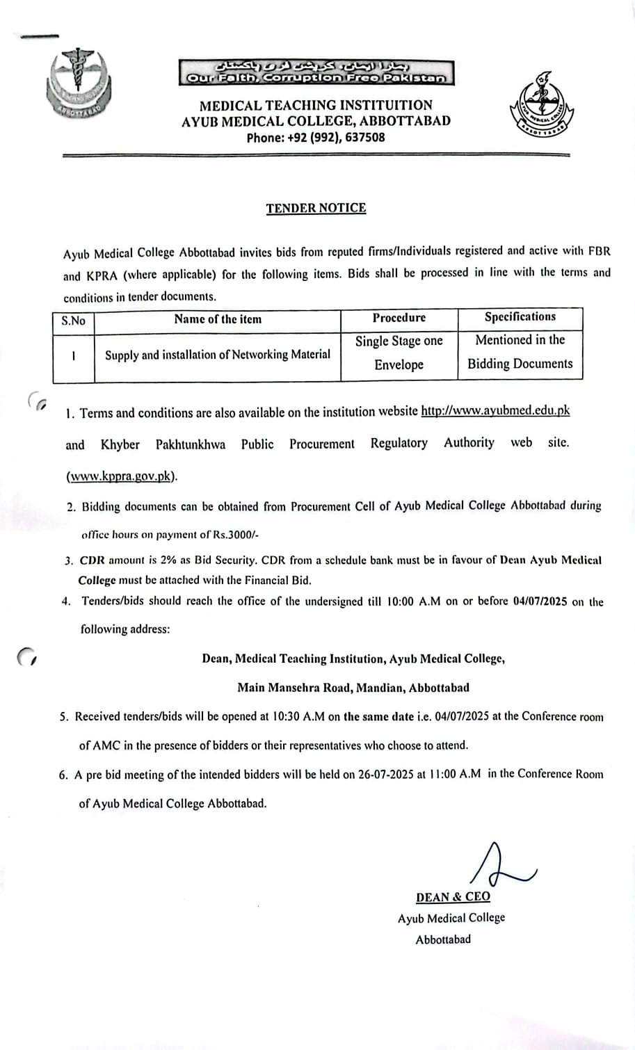 Prof. Dr. Irfan-ud-Din Khattak has assumed the charge of the post of Dean & CEO, Ayub Medical College, MTI, Abbottabad w.e.f. 02.10.2025 (FN).
