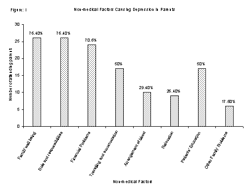 Figure–1 shows multiple factors causing depression in parents of children suffering from leukemia. 76.4% of attending parents presented with depression attributed their depression to the concerns relating to their family’s well being and change in role and responsibilities. 70.6% associated their depression with financial problems they faced after the diagnosis of leukemia in child; 76.4% said that main causes of their depression are traveling, relocation and accommodation problems. Approximately 29% said that difficulty in making arrangements of blood and its products for their child is the cause of depression while 17.6% attributed their depression to other family problems. Financial problems and difficulty arranging blood and its products were found to be related with depression in parents at borderline significance level. However, no significant relationship was found between depression in attending parents and their age, gender, education, occupation, and socioeconomic status.