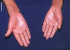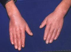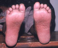 plaques over the skin of his palms and soles extending onto the dorsal surface
