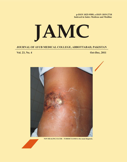 Journal of Ayub Medical College, Abbottabad is an OPEN ACCESS JOURNAL which means that all content is FREELY available without charge to all users whether registered with the journal or not. The work published by J Ayub Med Coll Abbottabad is licensed and distributed under the creative commons License CC BY ND Attribution-NoDerivs. Material printed in this journal is OPEN to access, and are FREE for use in academic and research work with proper citation. J Ayub Med Coll Abbottabad accepts only original material for publication with the understanding that except for abstracts, no part of the data has been published or will be submitted for publication elsewhere before appearing in J Ayub Med Coll Abbottabad. The Editorial Board of J Ayub Med Coll Abbottabad makes every effort to ensure the accuracy and authenticity of material printed in J Ayub Med Coll Abbottabad. However, conclusions and statements expressed are views of the authors and do not reflect the opinion/policy of J Ayub Med Coll Abbottabad or the Editorial Board.
