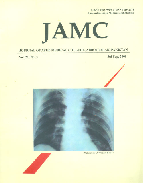 Journal of Ayub Medical College, Abbottabad is an OPEN ACCESS JOURNAL which means that all content is FREELY available without charge to all users whether registered with the journal or not. The work published by J Ayub Med Coll Abbottabad is licensed and distributed under the creative commons License CC BY ND Attribution-NoDerivs. Material printed in this journal is OPEN to access, and are FREE for use in academic and research work with proper citation. J Ayub Med Coll Abbottabad accepts only original material for publication with the understanding that except for abstracts, no part of the data has been published or will be submitted for publication elsewhere before appearing in J Ayub Med Coll Abbottabad. The Editorial Board of J Ayub Med Coll Abbottabad makes every effort to ensure the accuracy and authenticity of material printed in J Ayub Med Coll Abbottabad. However, conclusions and statements expressed are views of the authors and do not reflect the opinion/policy of J Ayub Med Coll Abbottabad or the Editorial Board.